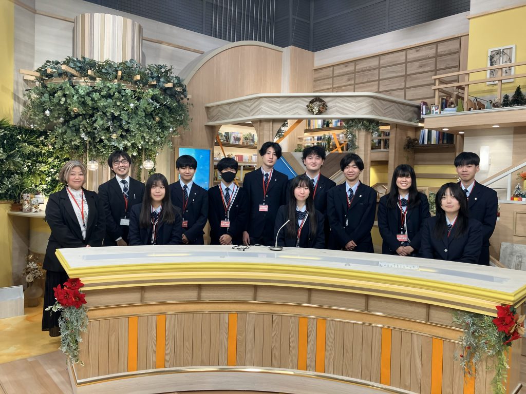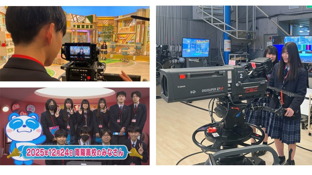 地域連携/学校生活 放送局見学会に行きました 2026年1月7日 12 月 24 日、希望者 10 名が CBC テレビ・CBC ラジオを訪問し、見学を行いました。普段テレビで目にするスタジオや、カメラの切り替えを行う副調整室、ラジオスタジオ、美術倉庫など、テレビ・ラジオ制作の裏側を見学しました。また、スタジオでは実際にカメラ操作を体験する機会もあり、生徒たちは番組制作の現場を間近で感じることができました。メディアの仕事に対する理解を深める、非常に有意義な時間となりました。