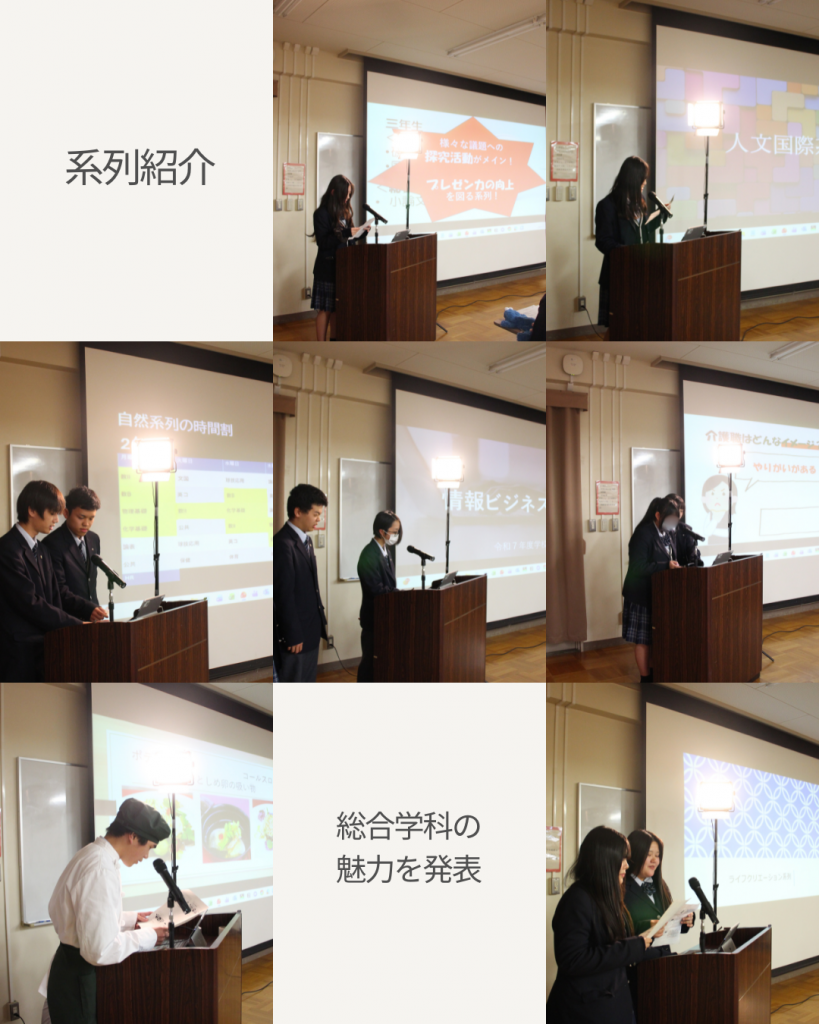 学校長あいさつのあと、生徒会執行部による学校紹介、1年生代表生徒2名による合格体験について話しました。続いて、総合学科の特色である系列についての説明を代表者がスライドを用いて行い、自分の所属する系列の魅力を伝えました。その後、希望者を対象に、体験授業(自然科学系列・情報ビジネス系列・福祉ネットワーク系列)や、個人相談を行いました。